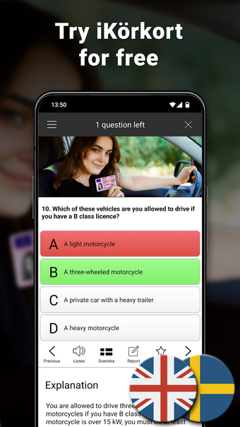 iKörkort Lite adalah aplikasi teori SIM terbaik. Ini berisi semua hal terbaru dan paling penting, seperti tes teori kelas B, aturan lalu lintas baru, dan perubahan, serta hal-hal yang relevan untuk ujian SIM.